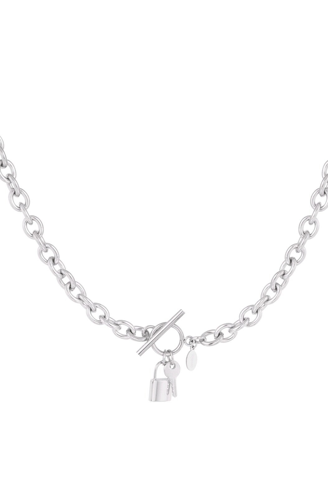 Wauw! Shop nu deze toffe zilveren ketting met schakels en bedels in de vorm van een slot en sleutel! De ketting wordt afgewisseld met ronde schakels en is superleuk te combineren met meerdere subtiele kettinkjes. De ketting is gemaakt van stainless steel en is door de ronde sluiting van 45 cm. Combineer de ketting met leuke accessoires en jij bent ready voor dat leuke feestje. Verkrijgbaar in de kleur zilver.