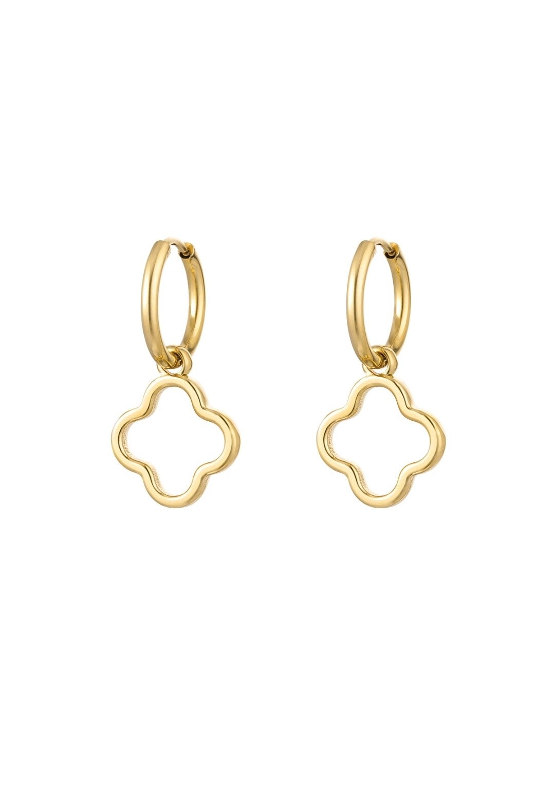 Hoe tof is dit paar gouden oorbellen met een basic bedel in de vorm van een klaver. Dit paar oorbellen is uitstekend geschikt voor aankomend seizoen en kan zowel enkel als gecombineerd met andere oorbellen gedragen worden. Ook leuk om deze oorbellen te combineren met felgekleurde statement oorbellen. De oorbellen zijn gemaakt van Stainless steel en hebben een afmeting van 3,3 cm.