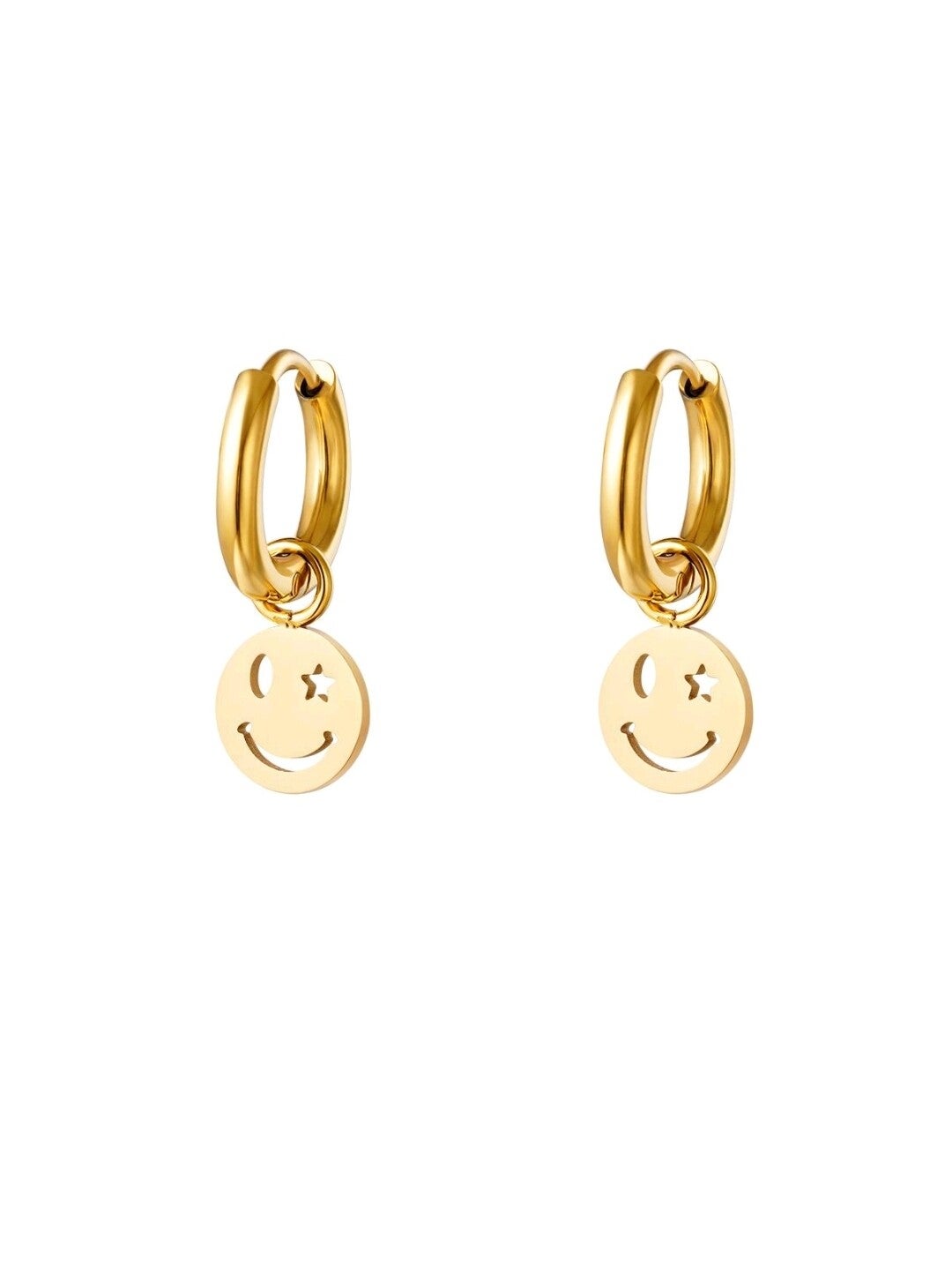 Hoe schattig zijn deze vrolijke smiley oorbellen met sterdetail. Met deze leuke oorbellen steel jij gegarandeerd de show! De smiley oorbellen zijn gemaakt van stainless steel in de kleur goud. Naast goud is ook de zilveren variant in de oorbellencollectie opgenomen. De oorbellen hebben een lengte van 2,1 cm
